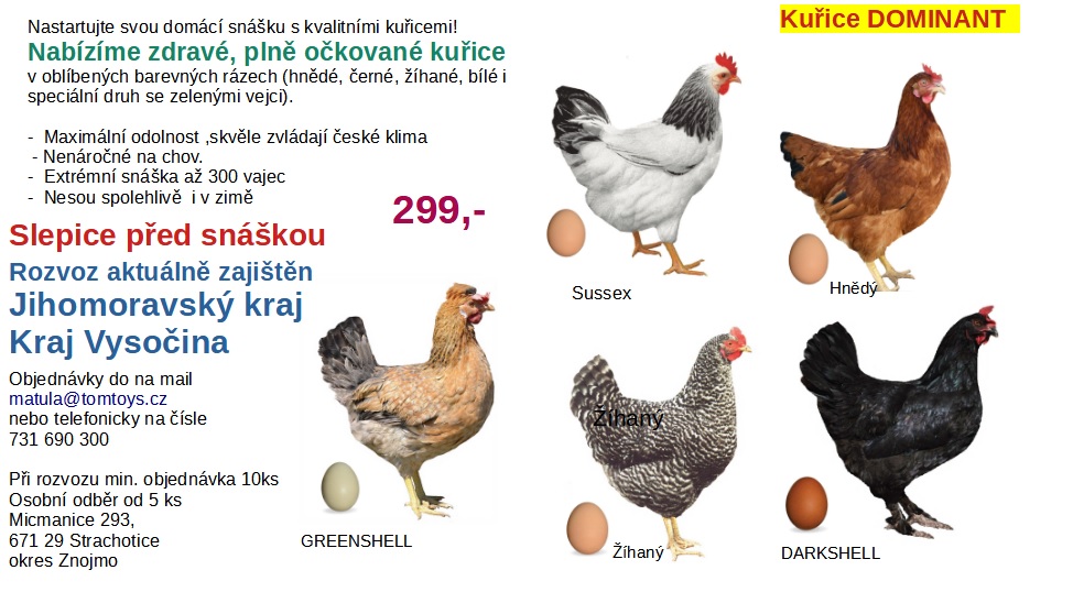 Nabízíme zdravé a plně očkované kuřice v různých barevných rázech, které jsou ideální pro domácí chov. Tyto slepice se skvěle přizpůsobují českému klimatu a jsou nenáročné na péči, přičemž dosahují extrémní snášky až 300 vajec ročně. Kuřice také spolehlivě snáší i v zimních měsících. Rozvoz je aktuálně zajištěn pro Jihomoravský kraj a Kraj Vysočina, s minimální objednávkou 10 kusů pro rozvoz a 5 kusů pro osobní odběr. Pro objednávky se můžete obrátit na e-mail nebo telefonicky.