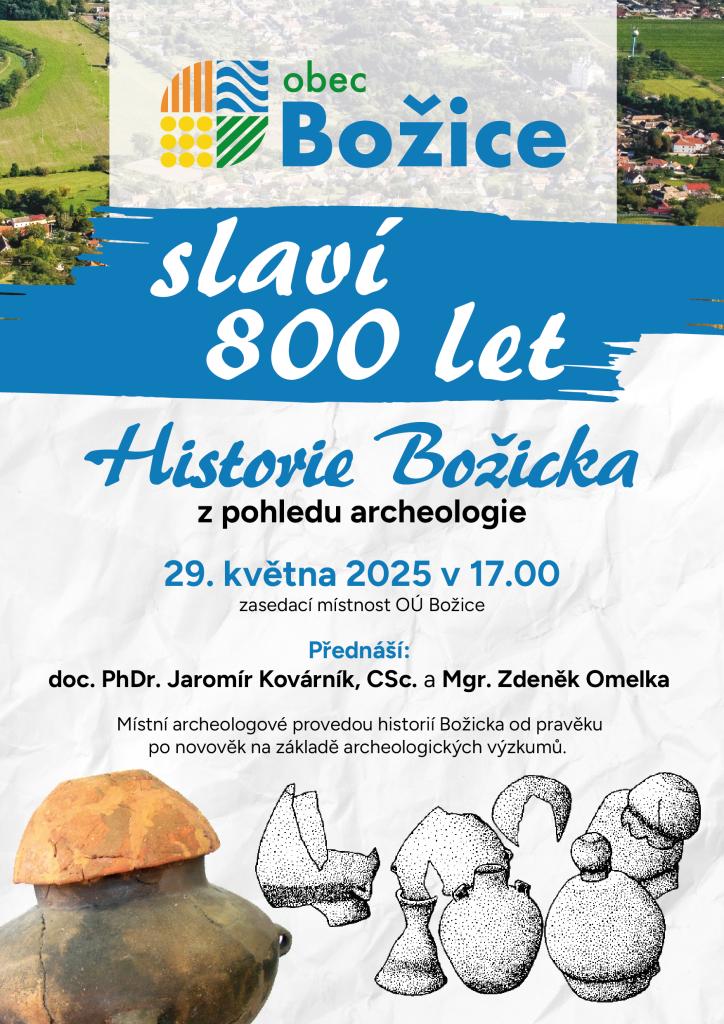 Zveme vás na zajímavou přednášku zaměřenou na archeologii v Božicích, kterou povedou odborníci doc. PhDr. Jaromír Kovárník, CSc. a Mgr. Zdeněk Omelka. Přednáška se zaměří na historii oblasti od pravěku až po novověk, přičemž budou prezentovány poznatky z archeologických výzkumů. Akce se koná 29. května v 17 hodin v zasedací místnosti OÚ Božice a je určena pro všechny, kdo mají zájem o místní historii a archeologii.