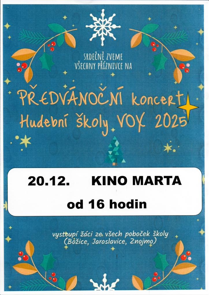 Zveme vás na vystoupení žáků ze všech poboček školy, které se uskuteční v kině Marta. Akce se koná 20. prosince 2025 od 16:00. Přijďte podpořit mladé talenty z Božic, Jaroslavic a Znojma. Těšíme se na vaši návštěvu a společně strávený čas.