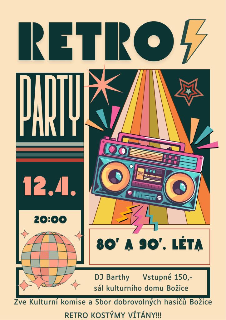Kulturní komise a Sbor dobrovolných hasičů Božice zvou na zábavnou retro párty. DJ Barthy se postará o skvělou hudbu z 80. a 90. let. Akce se koná v kulturním domě Božice, vstupné činí 150 Kč. Nezapomeňte na retro kostýmy!