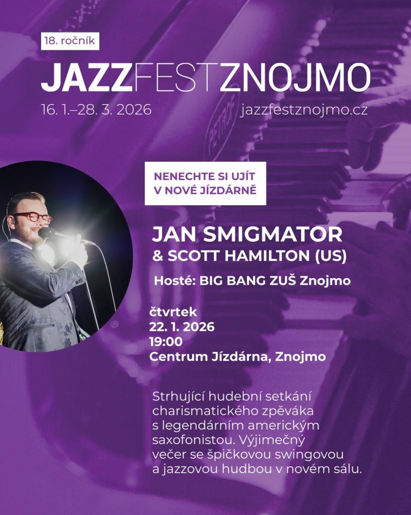 Zažijte premiérový koncert v nově zrekonstruované jízdárně Louckého kláštera. Charismatický Jan Smigmator se představí po boku legendárního amerického saxofonisty Scotta Hamiltona. Večer zahájí a během programu doprovodí BIG BANG ZUŠ Znojmo. Čeká vás výjimečný hudební zážitek a v novém kulturním prostoru Louckého kláštera.