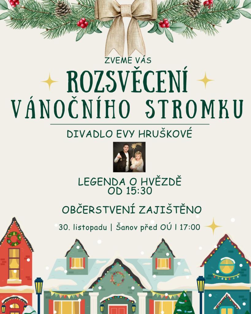 Zveme vás na rozsvícení vánočního stromečku, které se uskuteční 30. listopadu 2025 v 17:00. Návštěvníci se mohou těšit na divadlo Evy Hruškové s názvem 'Legenda o hvězdě' od 15:30 hod. Občerstvení bude zajištěno. Přijďte s námi oslavit tuto krásnou vánoční tradici.